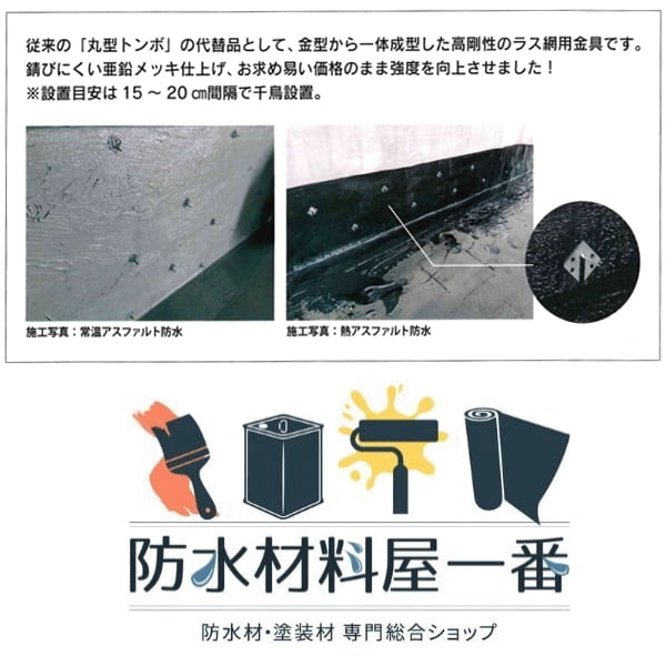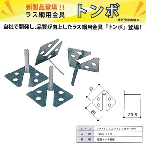 従来の丸型トンボの代替品として、金型から一体成型した高剛性構造のラス網用金具です。