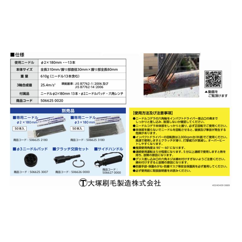 大塚刷毛 マルテーニードルコゲラ コード 506625 0020 サビ落とし 塗膜剥離 ハツリ 溶接スラグ除去 船舶サビ ケレン ニードル13本付 インパクトドライバー用 電動タガネ