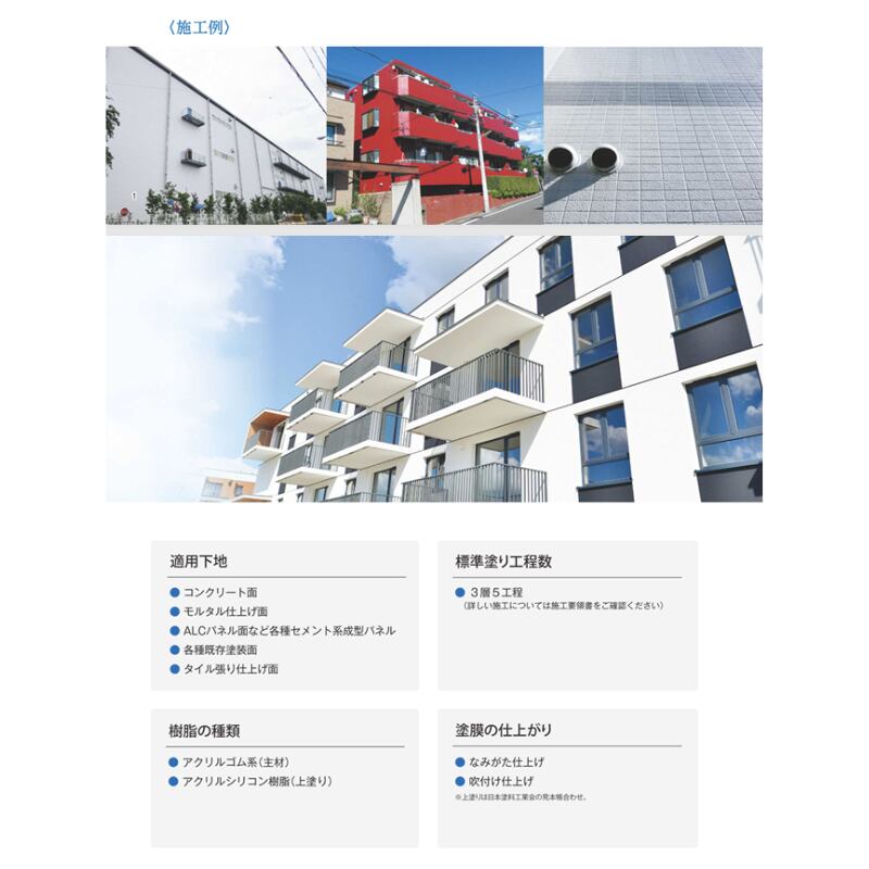 ローラー施工の場合、清水で0から10%、エアレススプレーの場合0から20%(重量比)、吹き付けの場合 0から20%を加えて均一に攪押した後、2回塗りで合計塗付量 0.30kg/平方メートルを使用して仕上げてください。