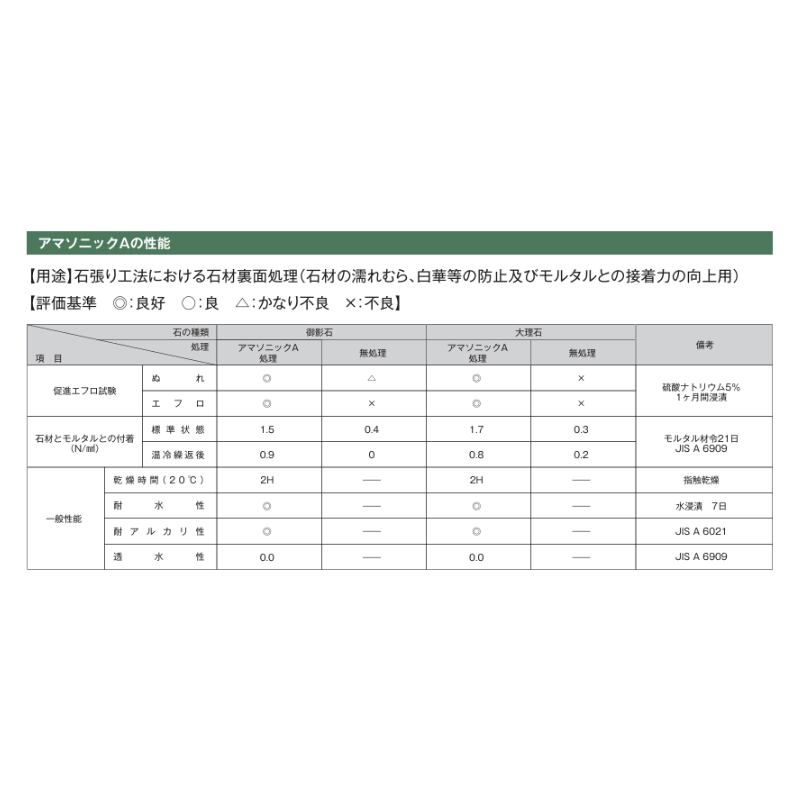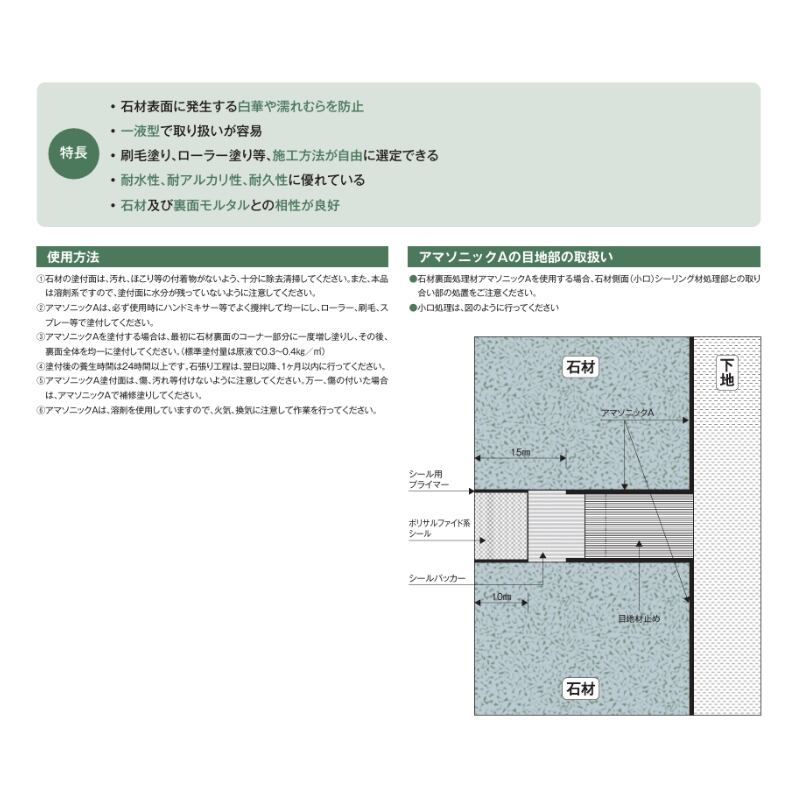 石材裏面処理材「アマソニックA」は石張り工法で裏面から浸透する水分で問題となっている白華、錆汁、水分等がにじみだすのを防ぎ、石材表面の美観を継続維持する効果を発揮します。
