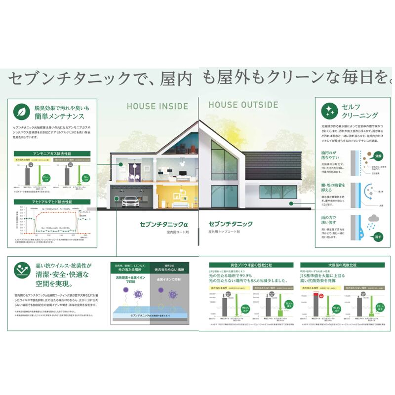「セブンチタニック」は、酸化チタンが太陽光の紫外線を浴びた時に発生する酸化分解作用と水になじみ易くなる親水化作用を利用することで、表面に付着した汚れを分解し、雨水などの力で洗い流す効果「セルフクリーニング機能」を発揮させる外壁用コーティング材です。