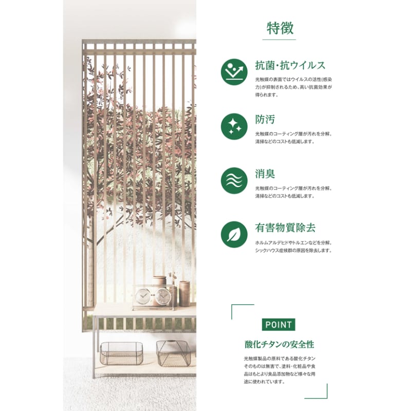 この機能は光触媒が自然エネルギーである太陽光を利用して発現され、太陽光発電など様々な分野でも行われており、自然や環境に優しいエコロジーな製品です。