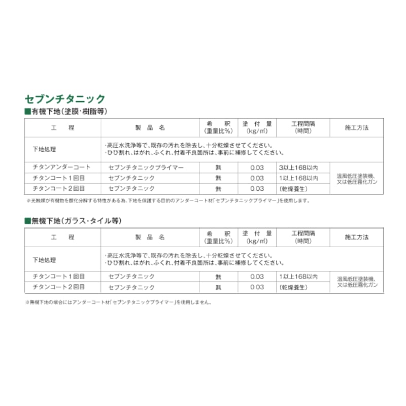 ・セブンチタニックを塗付した面でも、雨掛りの悪い場所では油煙、塵埃などの汚れ残りができます。