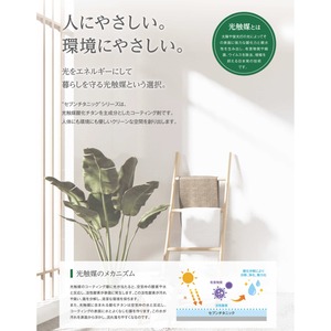 この機能は光触媒が自然エネルギーである太陽光を利用して発現され、太陽光発電など様々な分野でも行われており、自然や環境に優しいエコロジーな製品です。