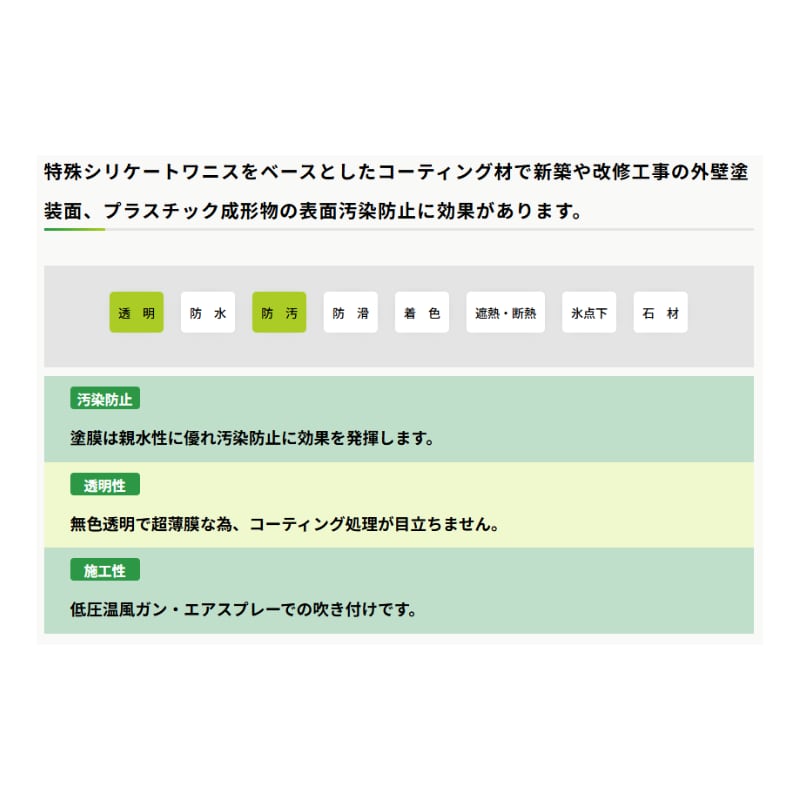 特殊シリケートワニスをベースとしたコーティング材で新築や改修工事の外壁塗装面、プラスチック成形物の表面汚染防止に効果があります。