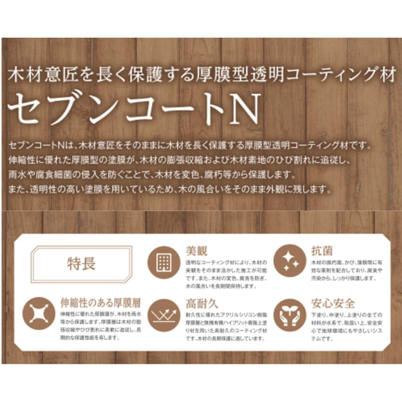 セブンコートNは、木材意匠をそのままに木材を長く保護する防水型透明コーティング材です。
