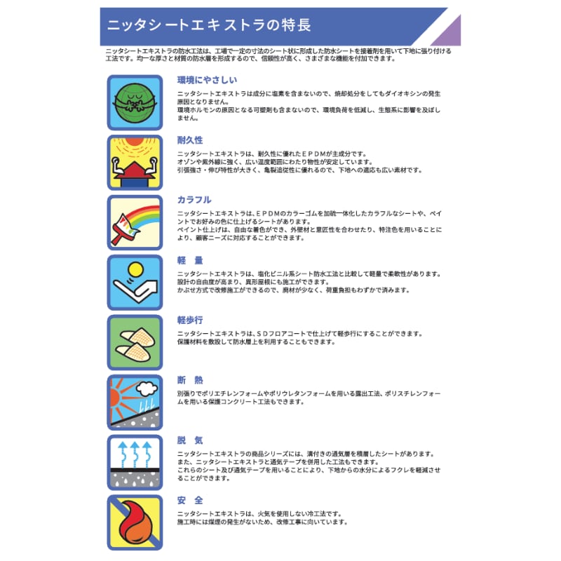 EPDMを主成分とした高耐久・高信頼性の業務用防水シートです。