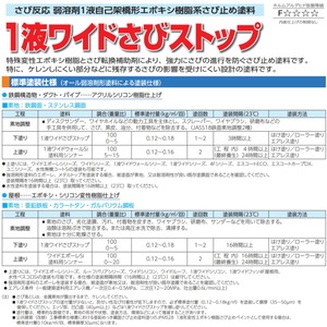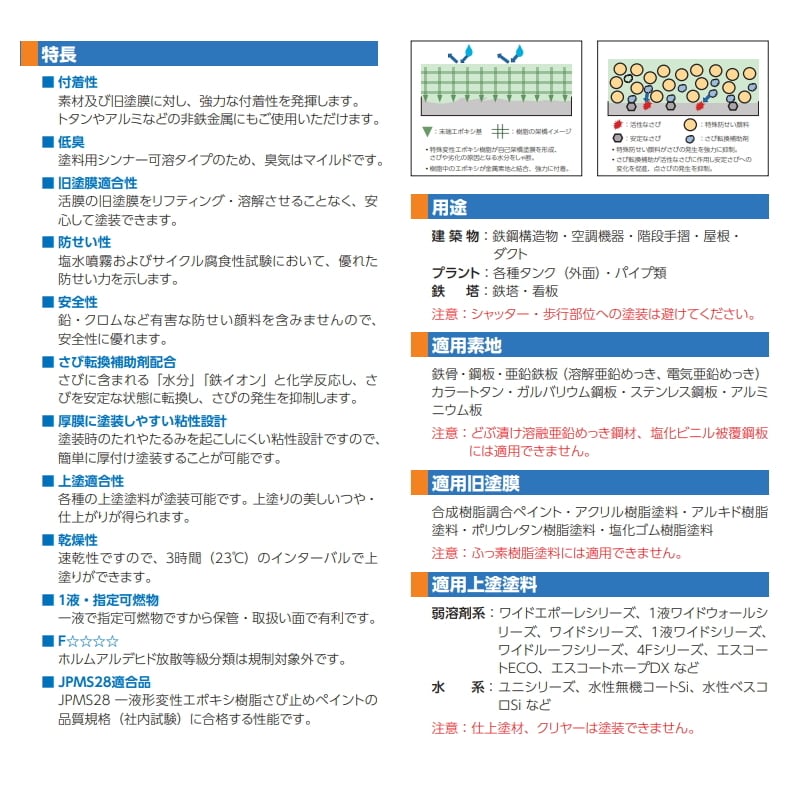 特殊変性エポキシ樹脂とさび転換補助剤を配合した、鉄部用の弱溶剤1液形さび止め塗料です。
