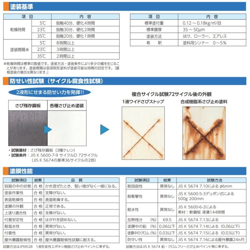 塩水噴霧試験およびサイクル腐食試験において優れた防せい力を示します。
