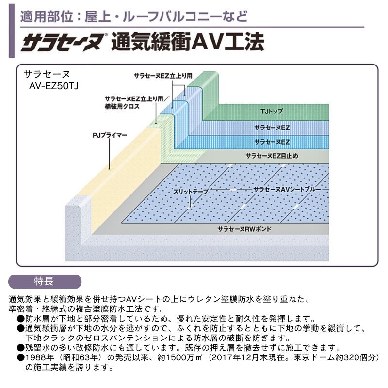 サラセーヌ AVシートはサラセーヌ通気緩衝AV工法で使用します。色はブルーとベージュがあり、異なる点は厚みと重さです。用途に応じてAVボンドで接着して下さい。