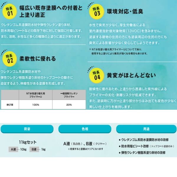 日本特殊塗料のNT水性塗替え用プライマーU 11kg/setはウレタン系防水、弾性ウレタン床材の改修用プライマーとして用いるプライマーです。